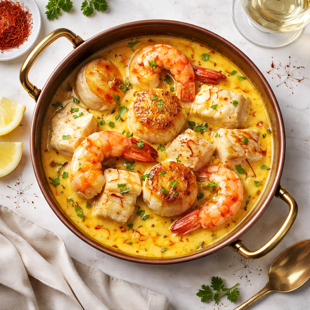 De beaux morceaux de poisson, des crevettes et des coquilles Saint Jacques dans une bisque de homard au cognac. Le tout est relevé d’une pointe de safran.